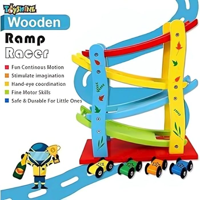 Give your kids endless fun with this high-quality wooden ramp racer, perfect for improving hand-eye coordination, fine motor skills, and imagination!